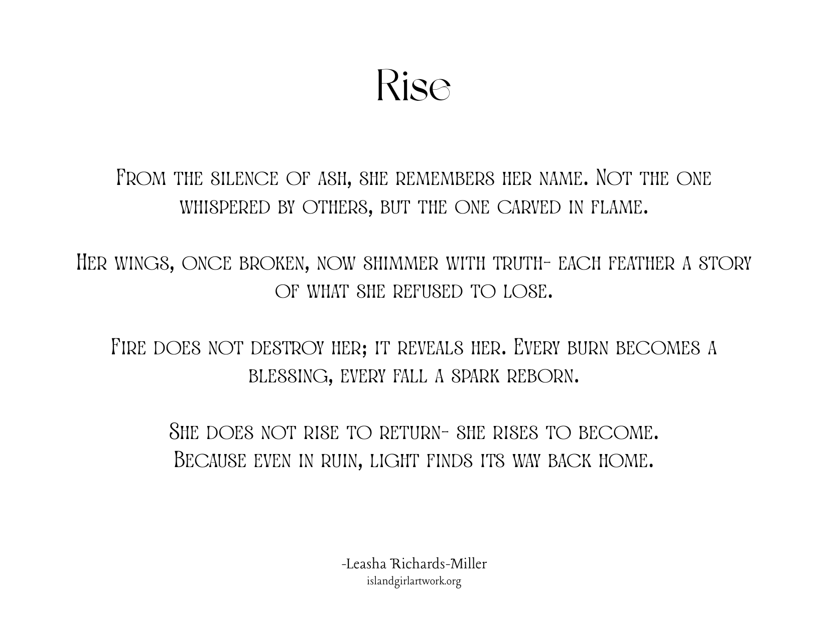 This painting captures the rebirth of the soul — a phoenix emerging from the ashes of its former self. It is a visual hymn to transformation, showing the moment when destruction becomes creation, when pain gives way to power, and when the spirit remembers its own divinity. The swirling golden and amber tones at the base represent the ashes — remnants of the past self, charred yet fertile with potential. From this molten center, energy spirals upward, forming a luminous figure that bursts with light and motion. The layered flames seem to breathe, as if the fire itself has consciousness — both destroyer and creator. At the top, softer blends of white, peach, and gold resemble wings or divine energy unfurling — the new self being born, illuminated and free. The symmetry evokes balance — the sacred meeting between death and rebirth, destruction and transcendence. The central form, resembling both a womb and a flame, reinforces that creation and rebirth are inseparable. The phoenix is not merely reborn — it is rebirthed through itself. The old form becomes the fuel for the new. This painting is not about escape from the ashes but alchemizing them — transforming suffering into strength, endings into evolution, and darkness into radiant flight. It is the spirit’s declaration: “I am not what burned — I am what rose.”